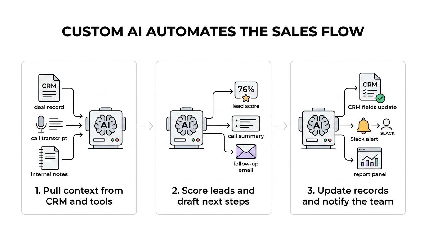 Off-the-shelf AI tools can help with isolated tasks, but sales operations rarely break in isolated ways. A rep may lose time pulling account context from the CRM, writing follow-ups after calls, updating deal stages, checking internal notes, and building pipeline reports. Those steps connect to each other, which is why custom AI works so well in sales. It can be designed around the full workflow, not just a single task.